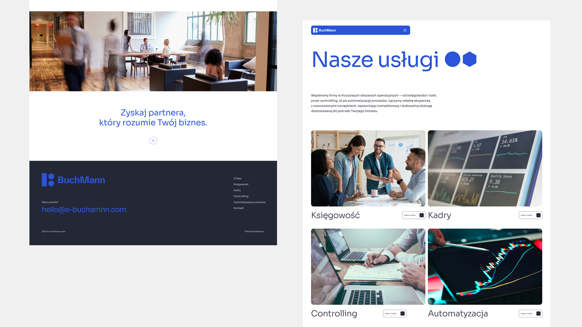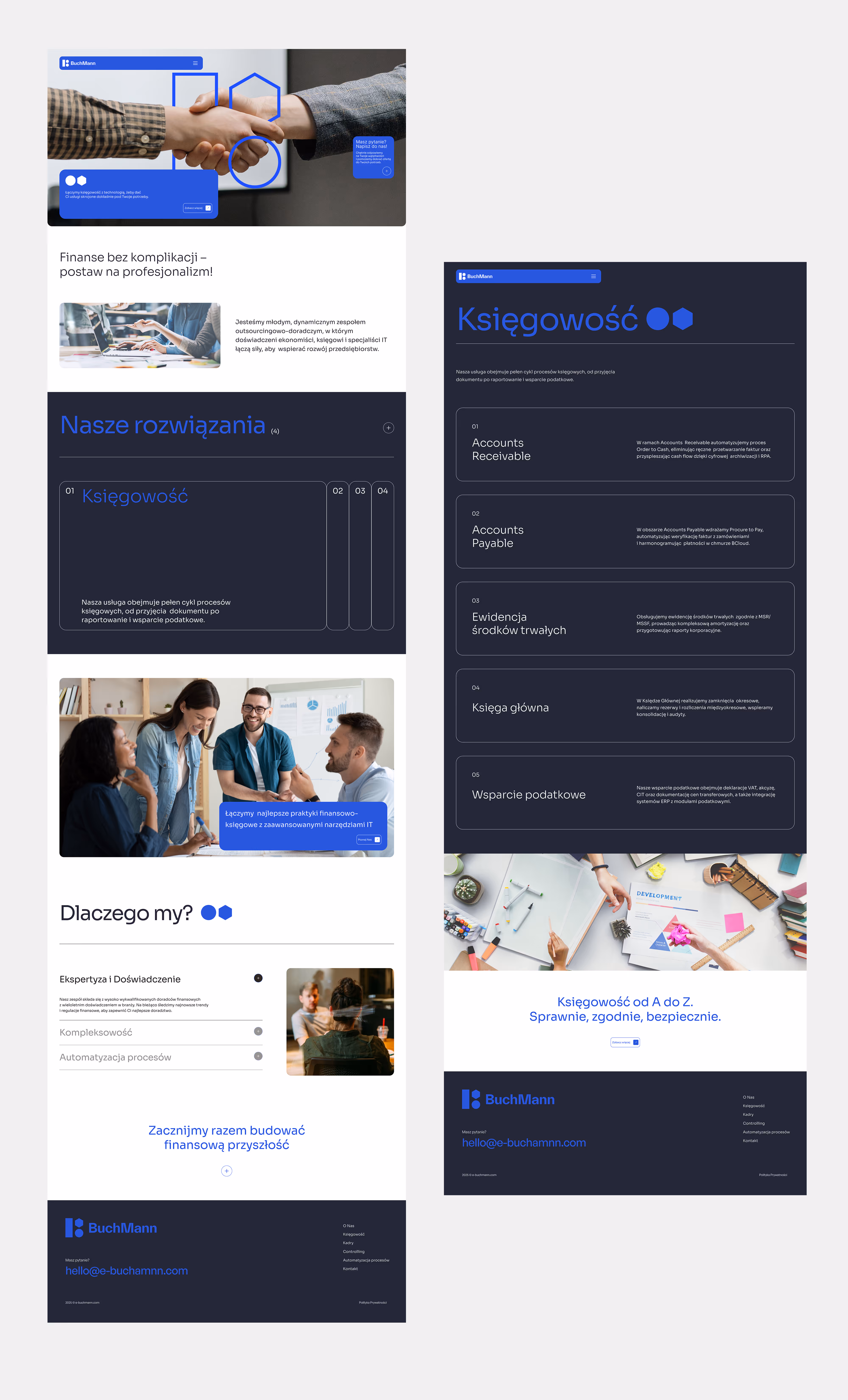 Strona Buchmann wykorzystuje minimalistyczny design i przejrzysty układ. Mocne nagłówki i prosta typografia podkreślają profesjonalizm. Ikony i numeracja sekcji symbolizują porządek i strukturę usług. Minimalizm kolorów wzmacnia czytelność i porządek treści, kontrastowe akcenty niebieskie podkreślają elementy kluczowe. Prezentacja zespołu akcentuje kompetencje i partnerskie podejście do klienta. Całość tworzy obraz firmy łączącej technologię, doświadczenie i rzetelność biznesową.